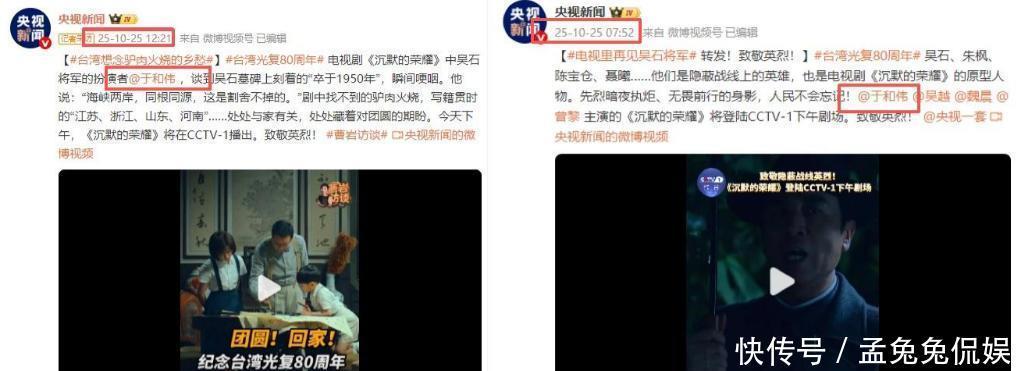 不仅如此,他在前年还评上了国家一级演员,在这种殊荣下,他也没有忘本,依旧是那个低调谦和的演员。今年他还饰演了《沉默的荣耀》里的吴石将军,因为过硬的演技和人品,央妈一天之内,两次点名表扬。央妈的肯定前几天,恰逢台湾光复80周年,央妈一天之内两次点名于和伟,因为《沉默的荣耀》讲的就是关于光复台湾的电视剧。