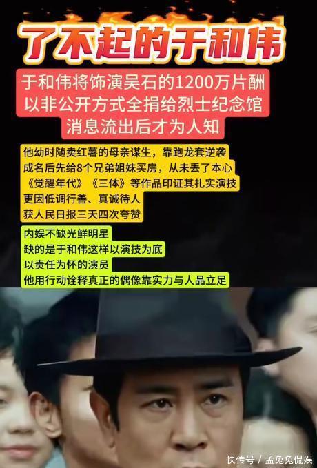 [免责声明]文章的时间、过程、图片均来自于网络,文章旨在传播正能量,均无低俗等不良引导,请观众勿对号入座,并上升到人身攻击等方面。观众理性看待本事件,切勿留下主观臆断的恶意评论,互联网不是法外之地。本文如若真实性存在争议、事件版权或图片侵权问题,请及时联系作者,我们将予以删除.信息来源:百度百科:于和伟个人资料演员于和伟向吴石烈士敬献鲜花.广州日报于和伟获评一级演员,网友“觉醒式”点赞!.光明网专访|于和伟:作品首先要“有意思”,才谈得上“有意义”.澎湃新闻于和伟:放弃铁饭碗考进上戏 潦倒时演一天只挣200.新浪娱乐